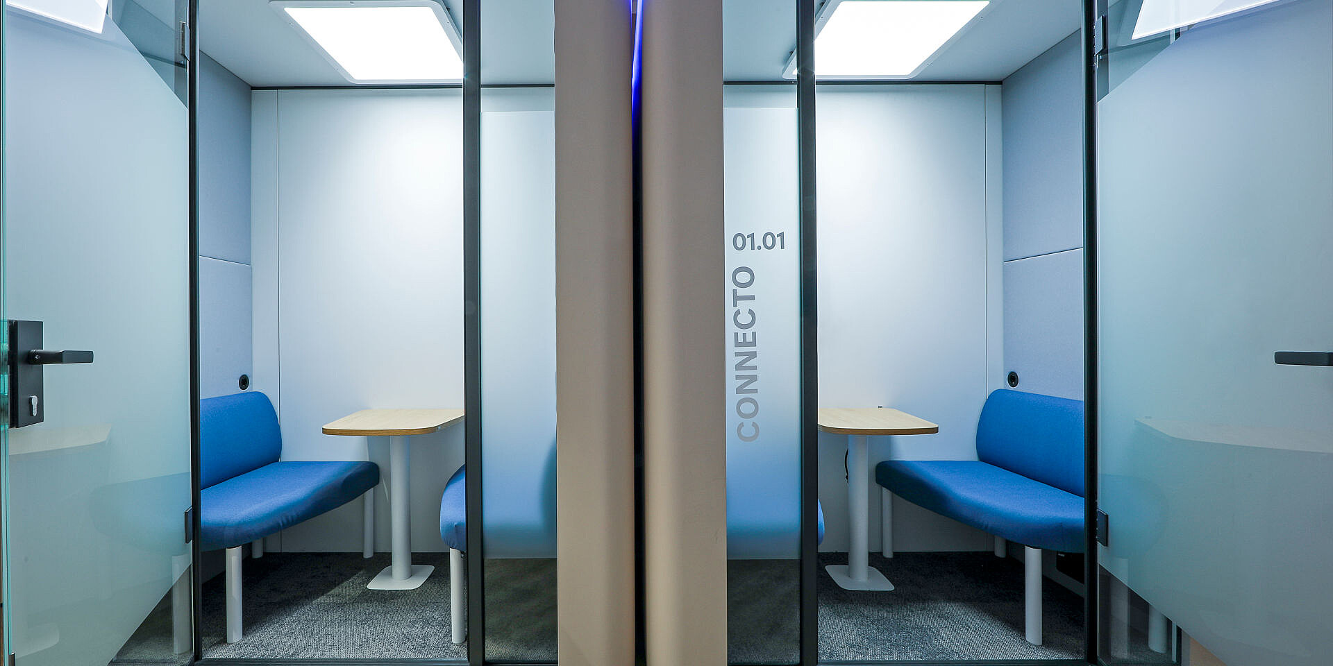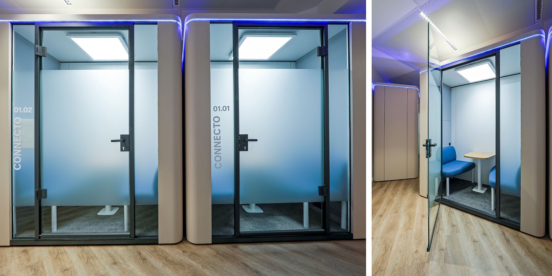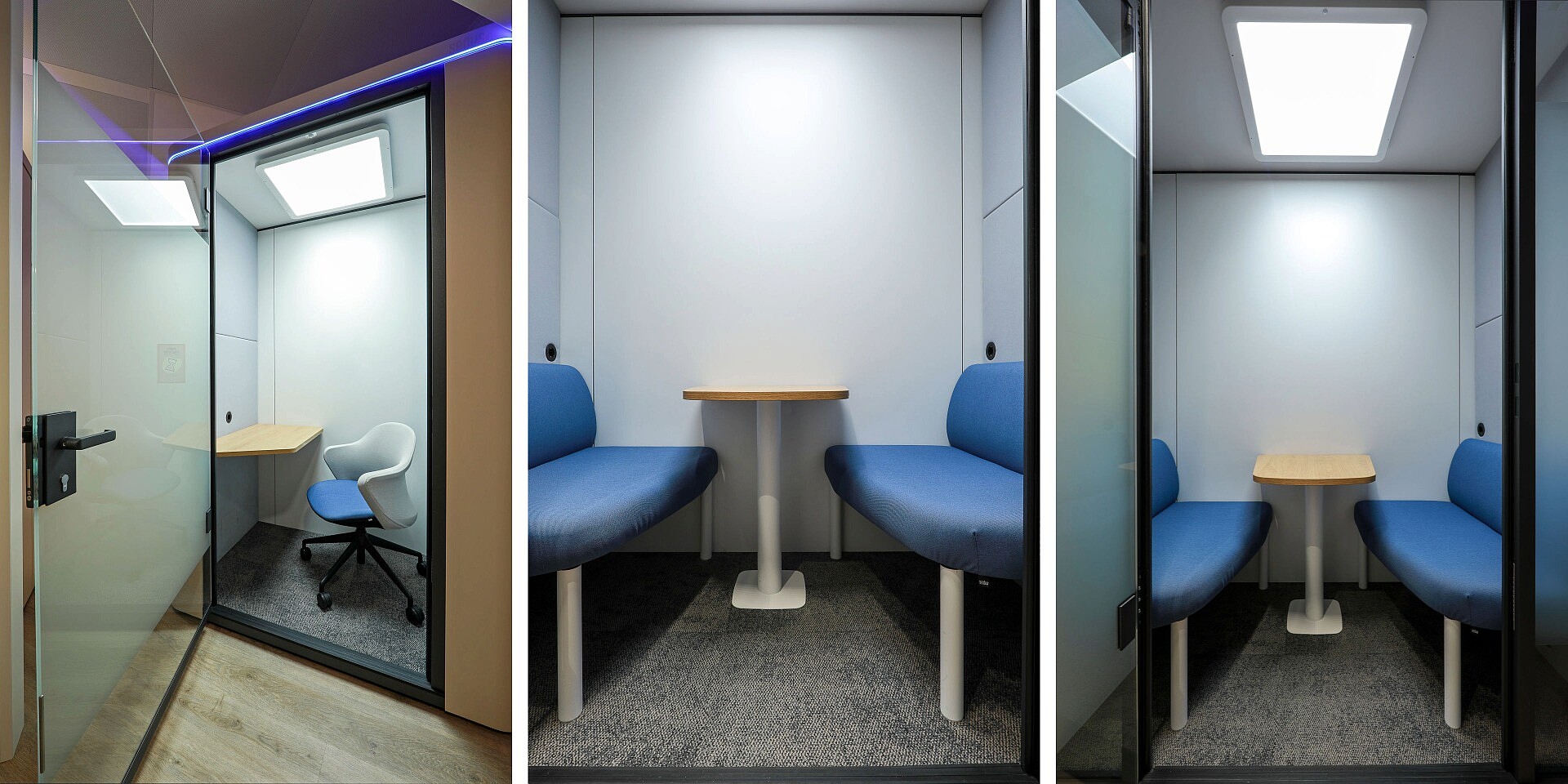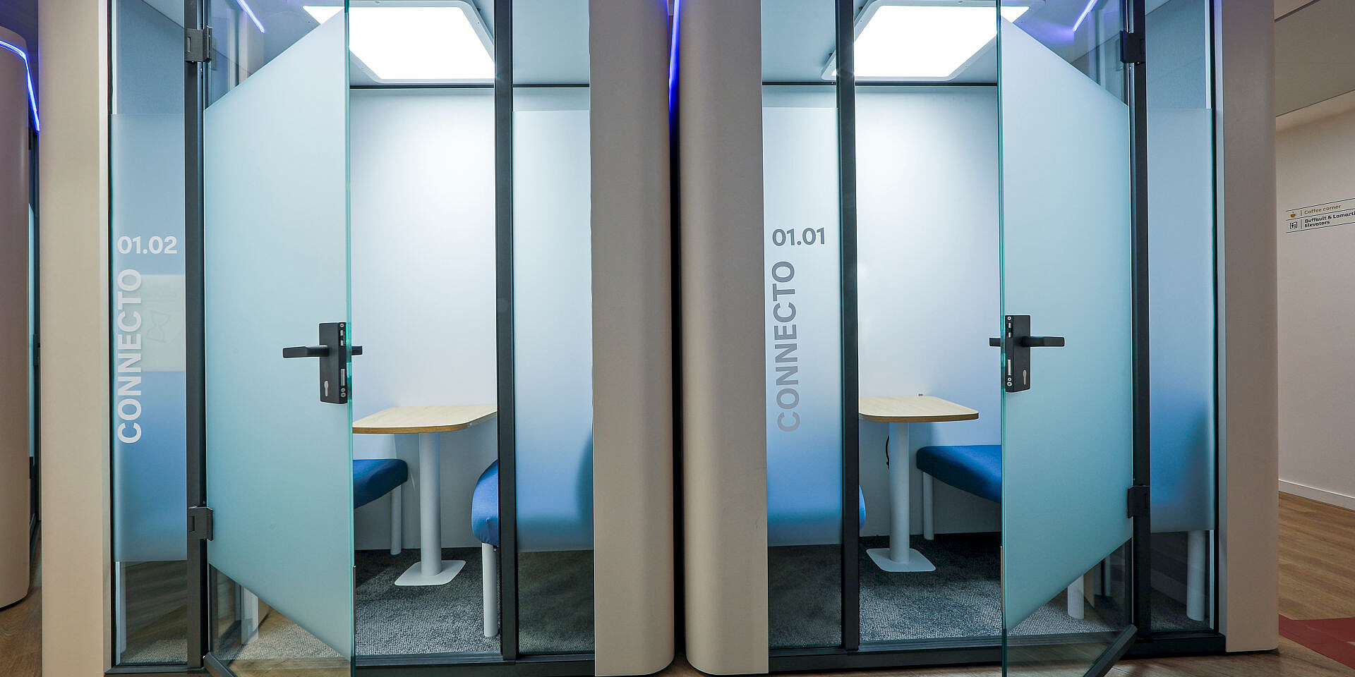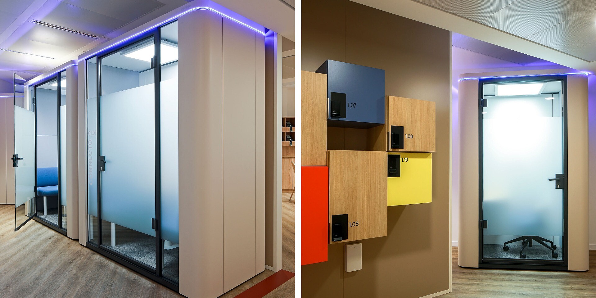 Für Phasen hoher Konzentration und individuellen Fokus stehen den Mitarbeitenden mehr als 70 se:cube Raum-in-Raum-Lösungen zur Verfügung. Diese Rückzugsorte schaffen akustisch geschützte, ruhige Zonen innerhalb der offenen Arbeitslandschaft und ermöglichen ungestörtes Arbeiten, persönliche Gespräche oder kurze Pausen. So entsteht ein ausgewogenes Verhältnis zwischen Offenheit und Rückzug – ein zentraler Bestandteil des ganzheitlichen Arbeitskonzepts.