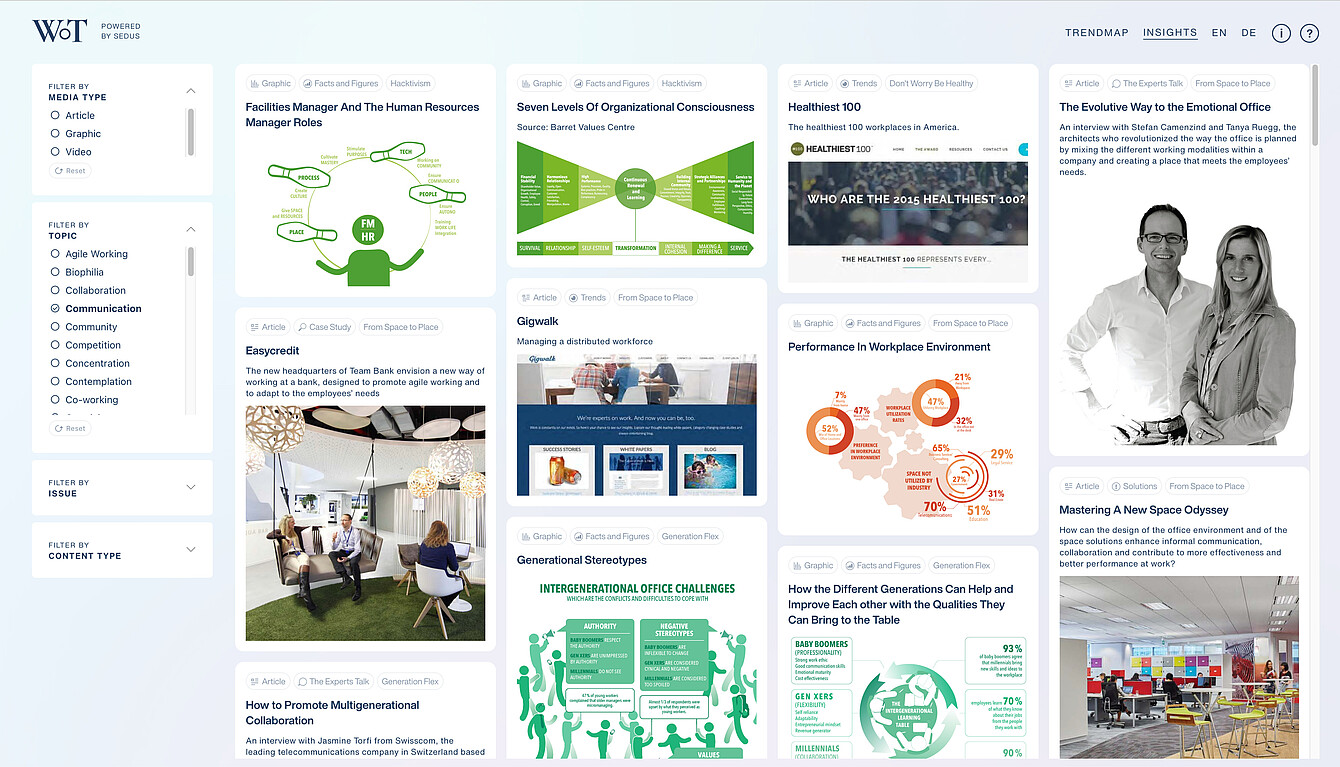 What awaits us in the future? How can we shape the Future of Work? Whenever there are new trends, new insights are gained or new ideas are born, Sedus is always in tune with the times. With the "Workscape of Tomorrow" platform, Sedus has launched a knowledge database based on the INSIGHTS trend monitor, which brings together the results of years of research into the working landscape.