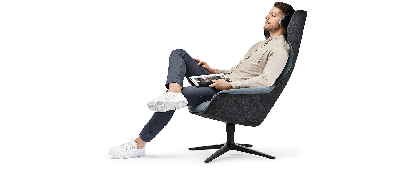 The lounge chair has a one-piece PET felt seat shell. The contour and height of the backrest provide optimum body and head support. The integrated armrests form the side finish. The organic contours convey harmony, whilst the seat pan and the handmade upholstery round off the comfort.