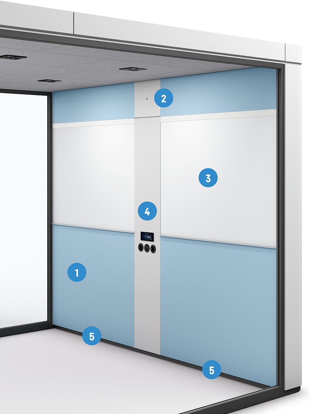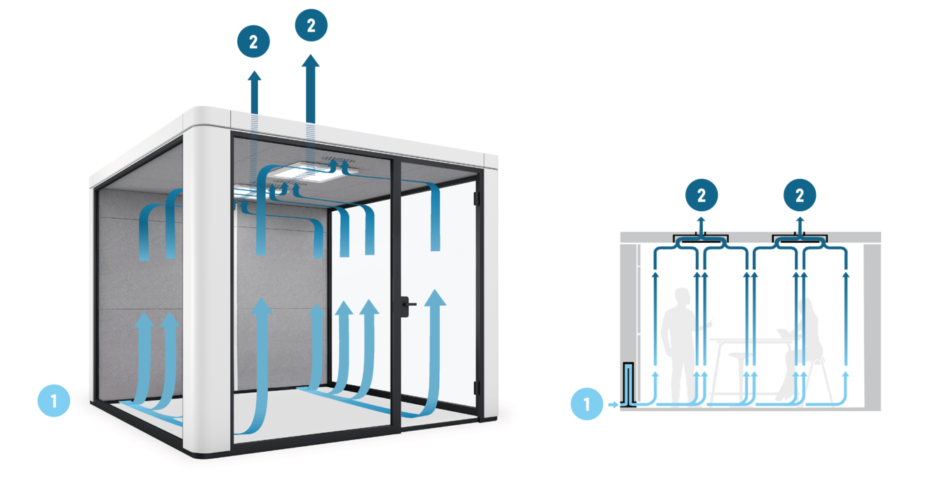 With the independent ventilation of the se:cube max, fresh air is supplied via the air inlets in the ceiling. The stale air is drawn into the lower part of the technical panel and released back into the surrounding room via the fans above the technical panel.