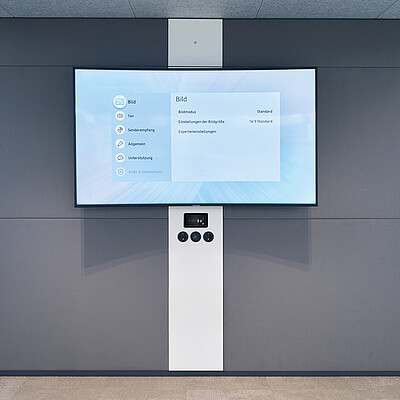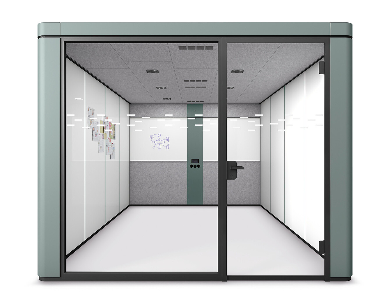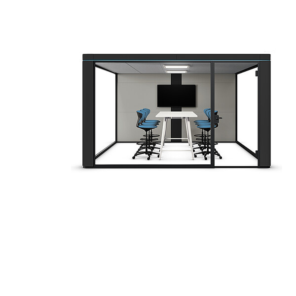 The upright wall panels of the closed walls of the se:cube max can be configured with writable whiteboard surfaces both on the inside and outside. The panels can be easily exchanged at a later date without using any tools. On the technical wall with the horizontal panels, the middle panel can also be supplemented with a whiteboard. It is also possible to mount a screen, in addition to a whiteboard.