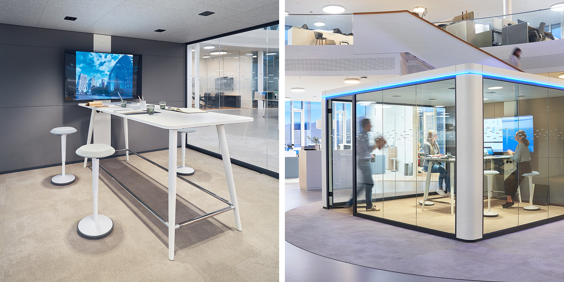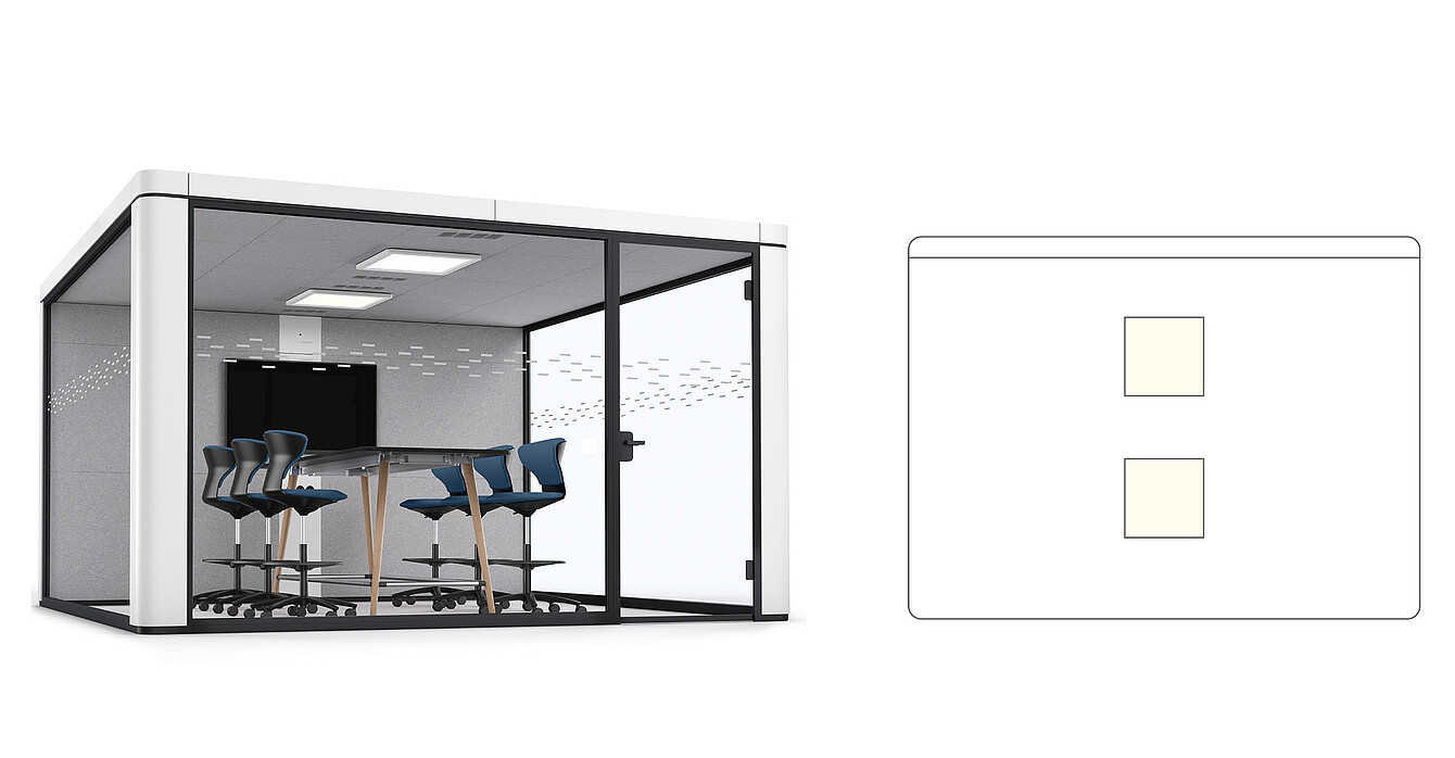 In this set-up, two LED panels are mounted in the centre of the room and perpendicular to the technical wall. This allows for homogeneous illumination of the workspace when a conference table is set up facing the technical wall. Users can choose between dimmable lighting and a version with colour temperature change and HCL control.