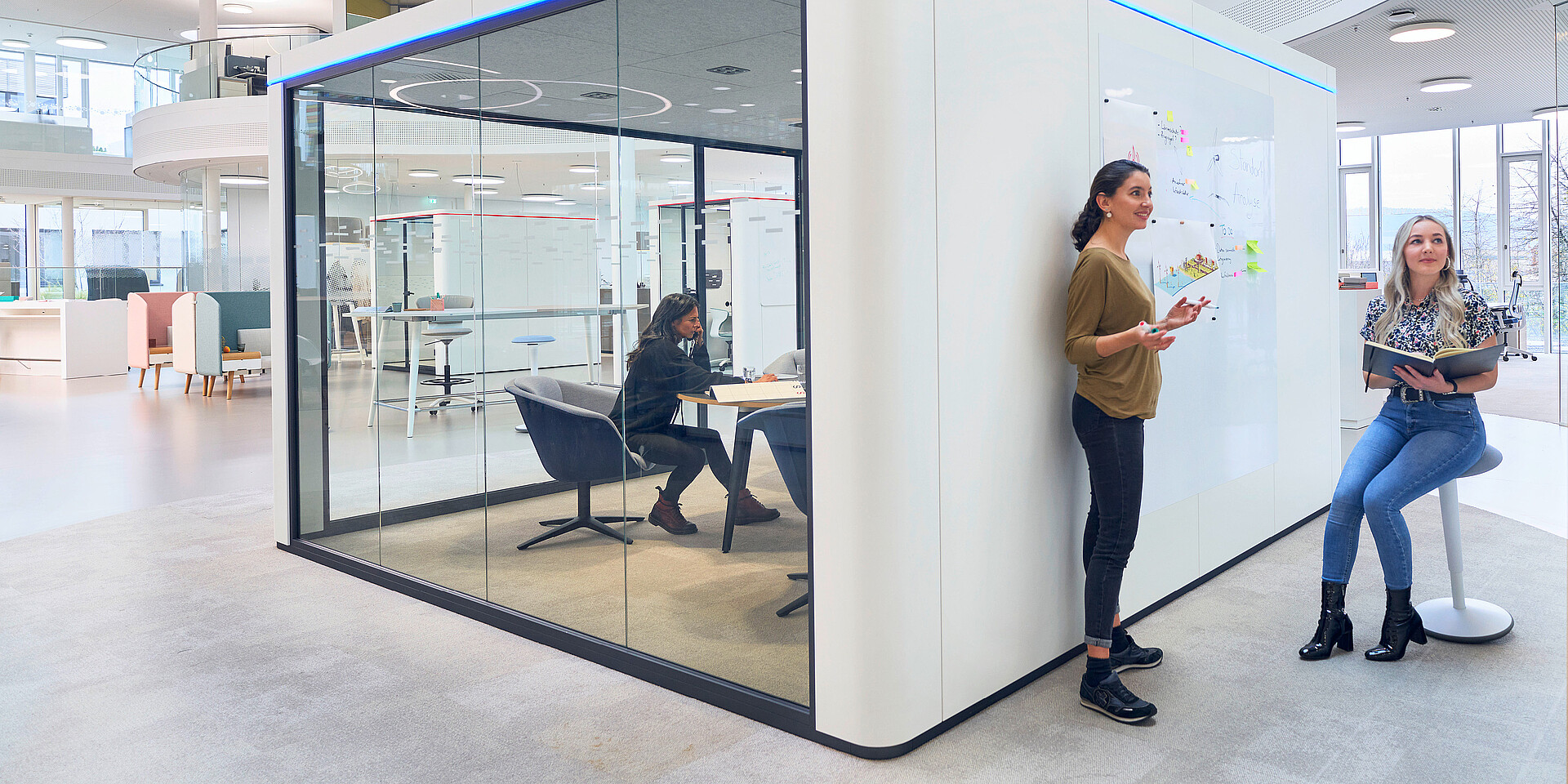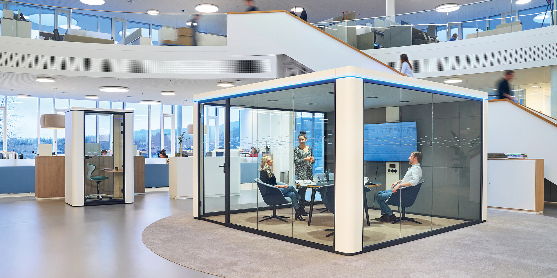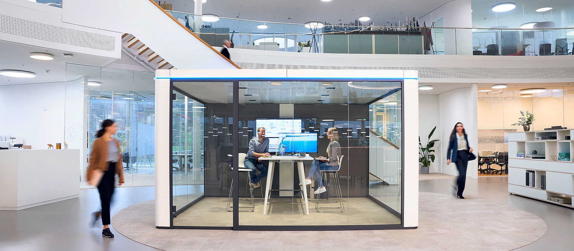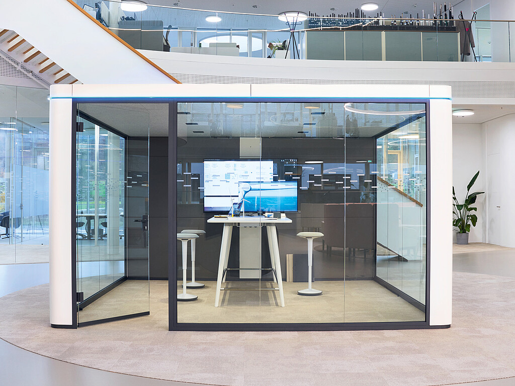 The sophisticated room-in-room system se:cube max complements the se:cube product family and offers large retreats for meetings, workshops and video conferences. The self-sufficient se:cube max can also be used as a single or double office in open-space landscapes. The base-free room-in-room system is not connected to the building structure and can, therefore, also be placed on surfaces with integrated floor heating.