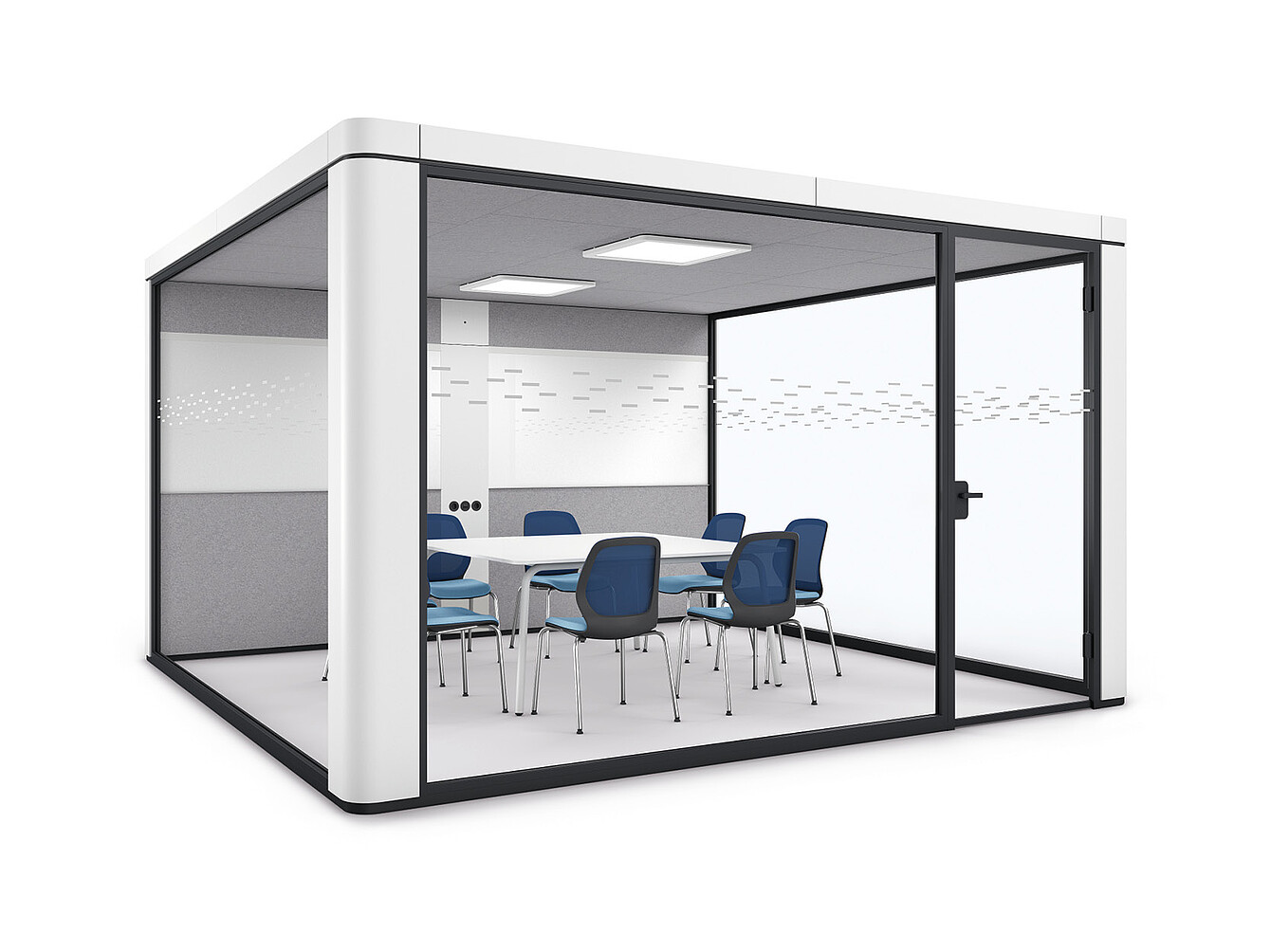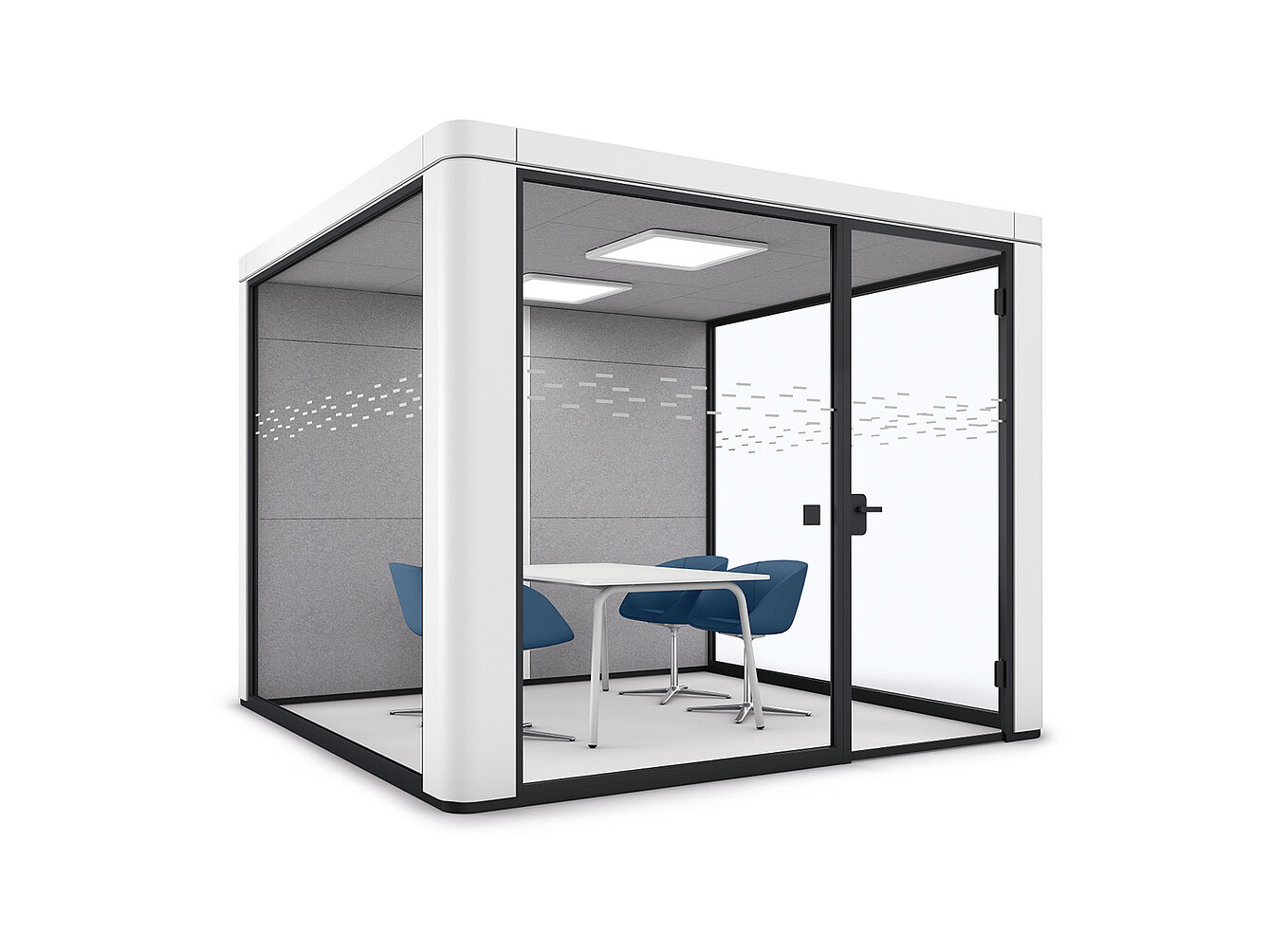 The sound insulation of the se:cube max is so good that the room-in-room system can be positioned in the middle of an office without neighbouring areas interfering with each other in terms of acoustics. se:cube max uses ceiling and wall absorbers specifically made for this purpose. The following factors also influence the room acoustics of the se:cube max: flooring, number of glazed or closed walls, interior design.