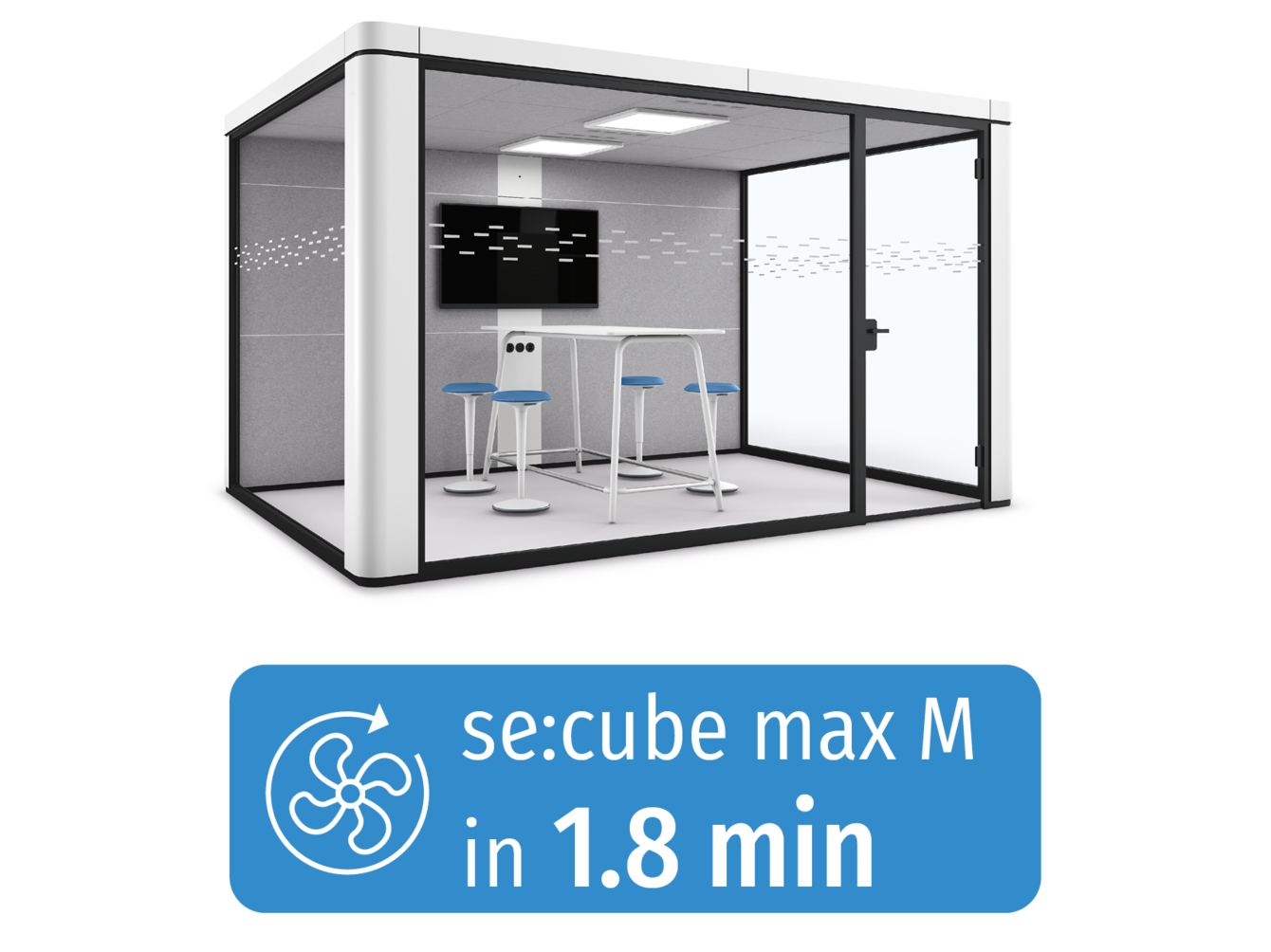 se:cube max is a closed-off room with acoustically effective components which interrupt the propagation of sound and improve speech intelligibility inside. The sound level reduction is 29 dB(A)*. Disturbing noises from the outside are not eliminated completely, however, they are significantly reduced.
