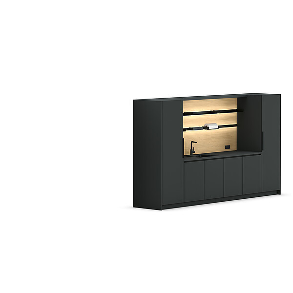 Modules can be installed without the need for tall cabinets against a wall or wall placement, and can also be used as free-standing room dividers. When used in this way, the back panel can be fitted with functional rails for hanging whiteboards and other accessories. A monitor can also be mounted.