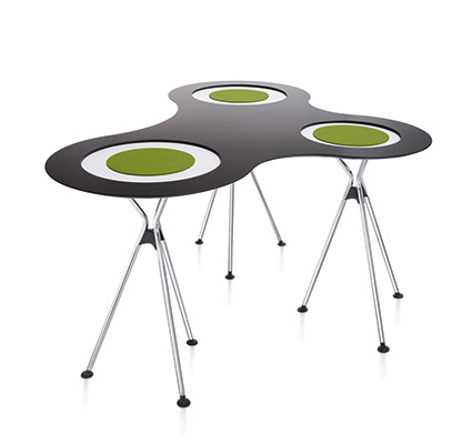 The table top of the standing meet table folds down so it stacks neatly. And it can be combined with meet table over easy for an inviting table combination. So several people can gather in a pleasant setting, which encourages informal communication in bistros, staff rest rooms and lounge areas. Table covers as an accessory in any of four colours complete the programme as well as offering additional design freedom.