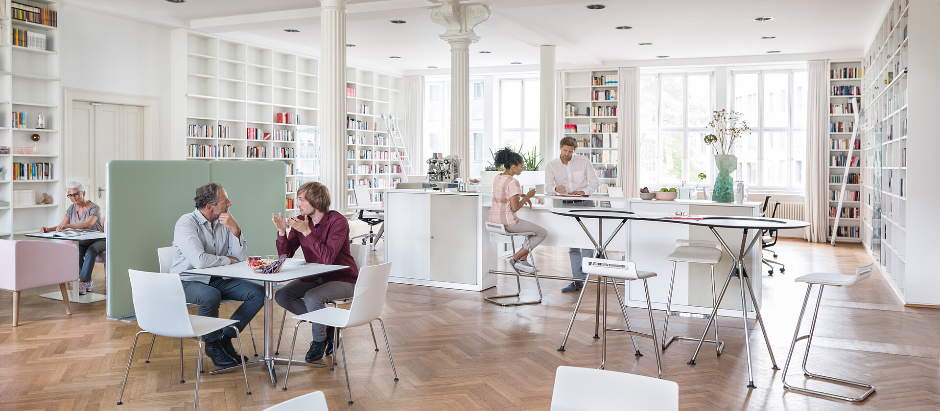 Sedus meet tables were designed to provide a pleasant, comfortable environment wherever people meet. They characterise places of rest and relaxation with graphic simplicity and conciseness. With distinct possibilities for individual design you draw inviting pictures for bistros, staff rest areas and canteens.
