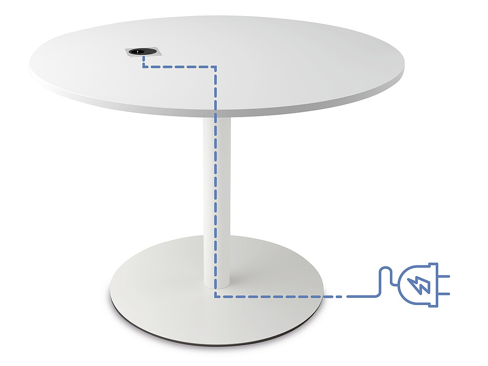 se:assist tables at sitting height can be optionally equipped with power and data cabling. The cable is guided through the column and can be guided out below the base plate and connected to the available power supply. The round grommets allow the cables to be guided through the table top and have a diameter of 70 mm. A spacious cable tray is available as an option for large tables with boat-shaped table tops.