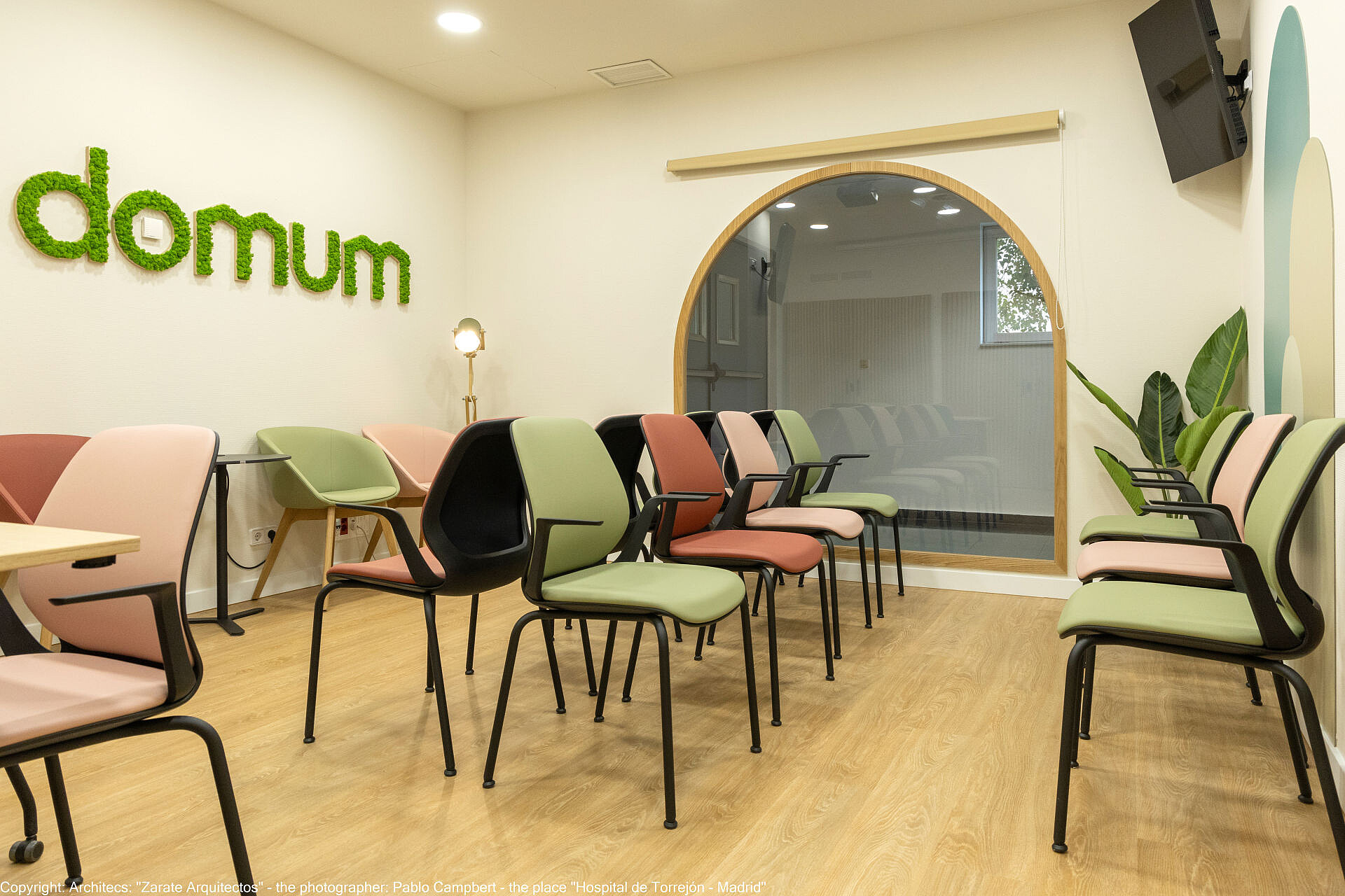 In 2024, a dedicated waiting area was created at the University Hospital in Torrejón de Ardoz, near Madrid. Spanning an area of 200 square metres, an oncological waiting area was created within an existing building, which not only offers patients and their companions space to wait, but also to work, relax and retreat.