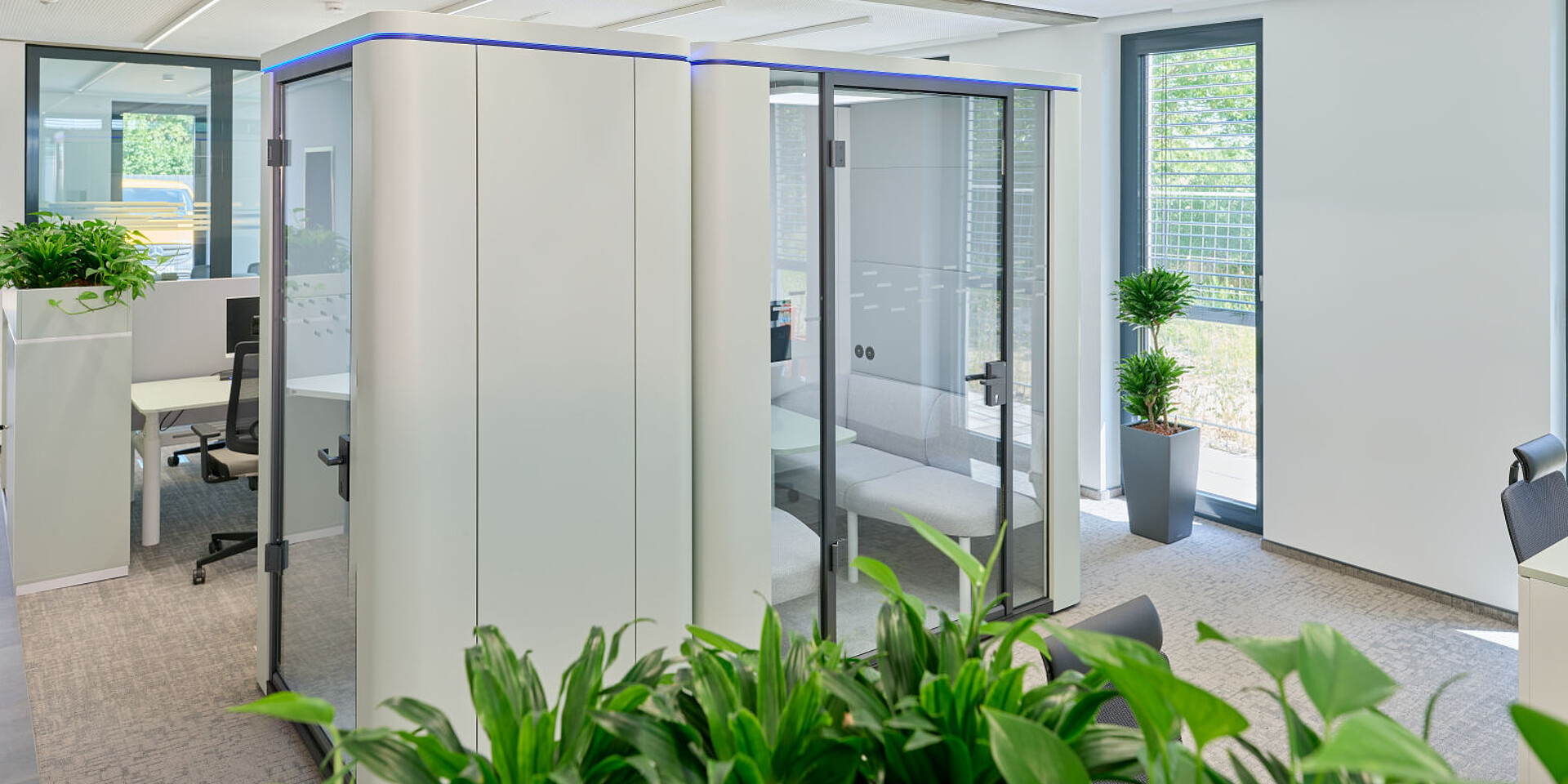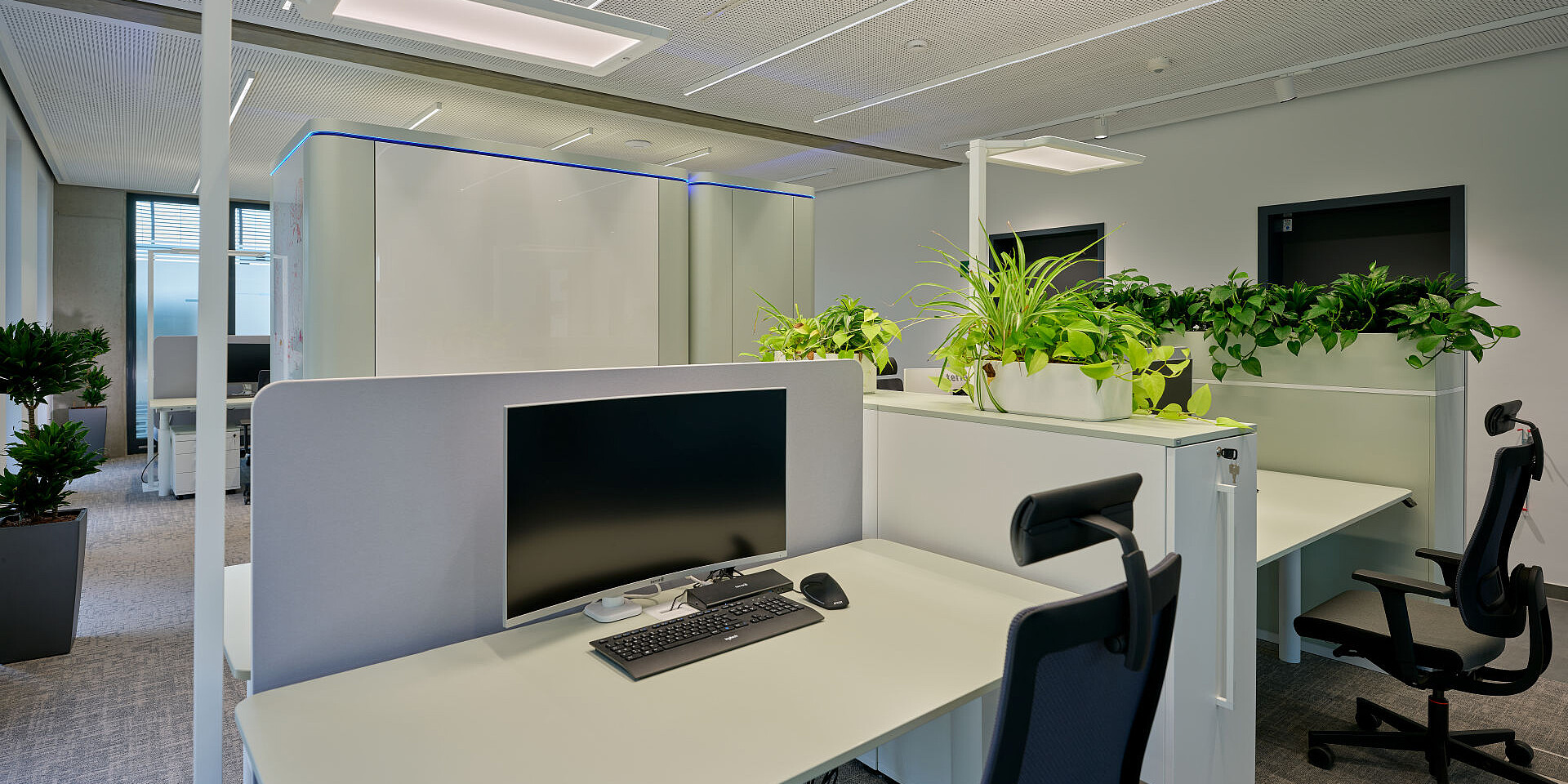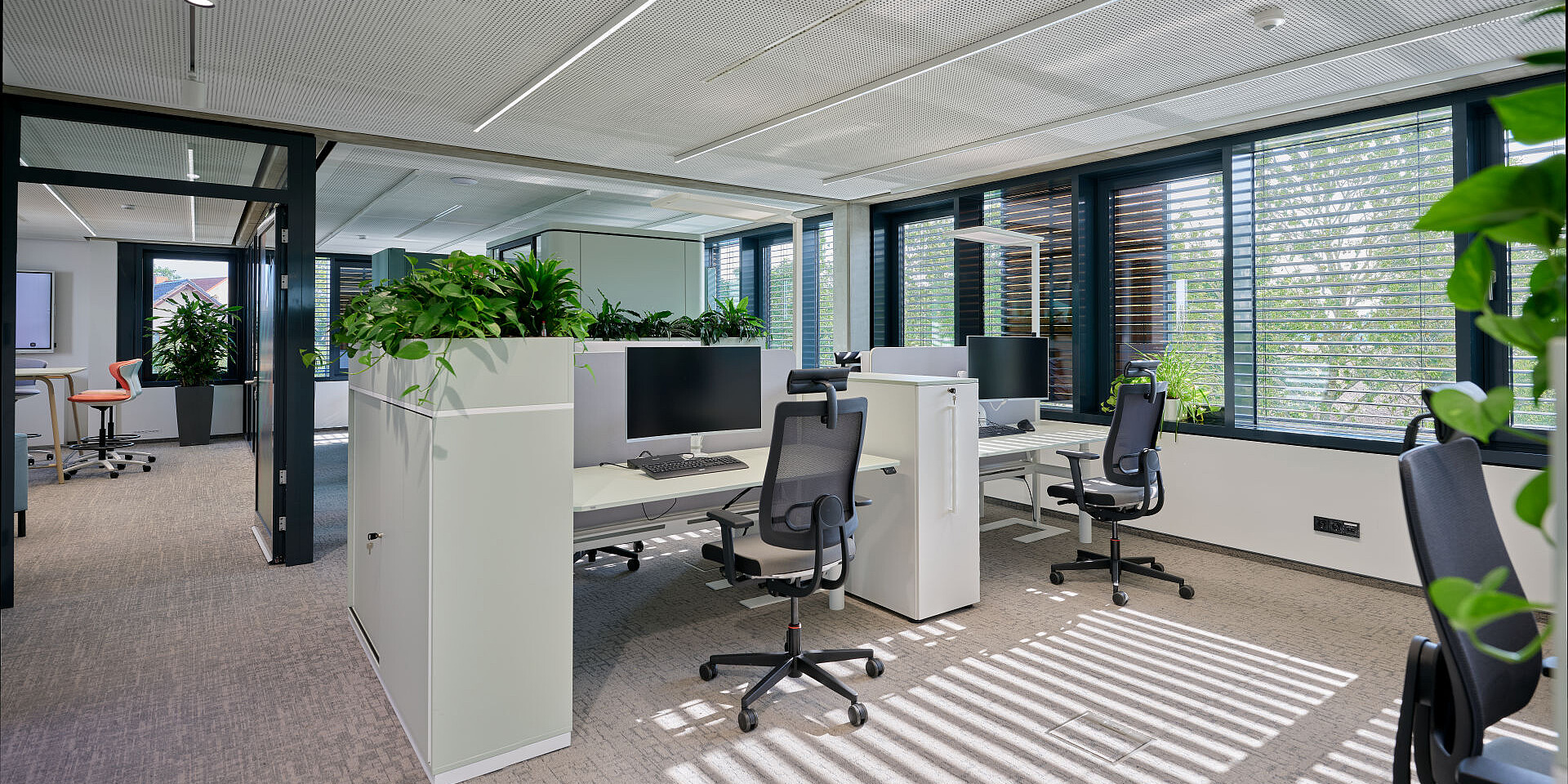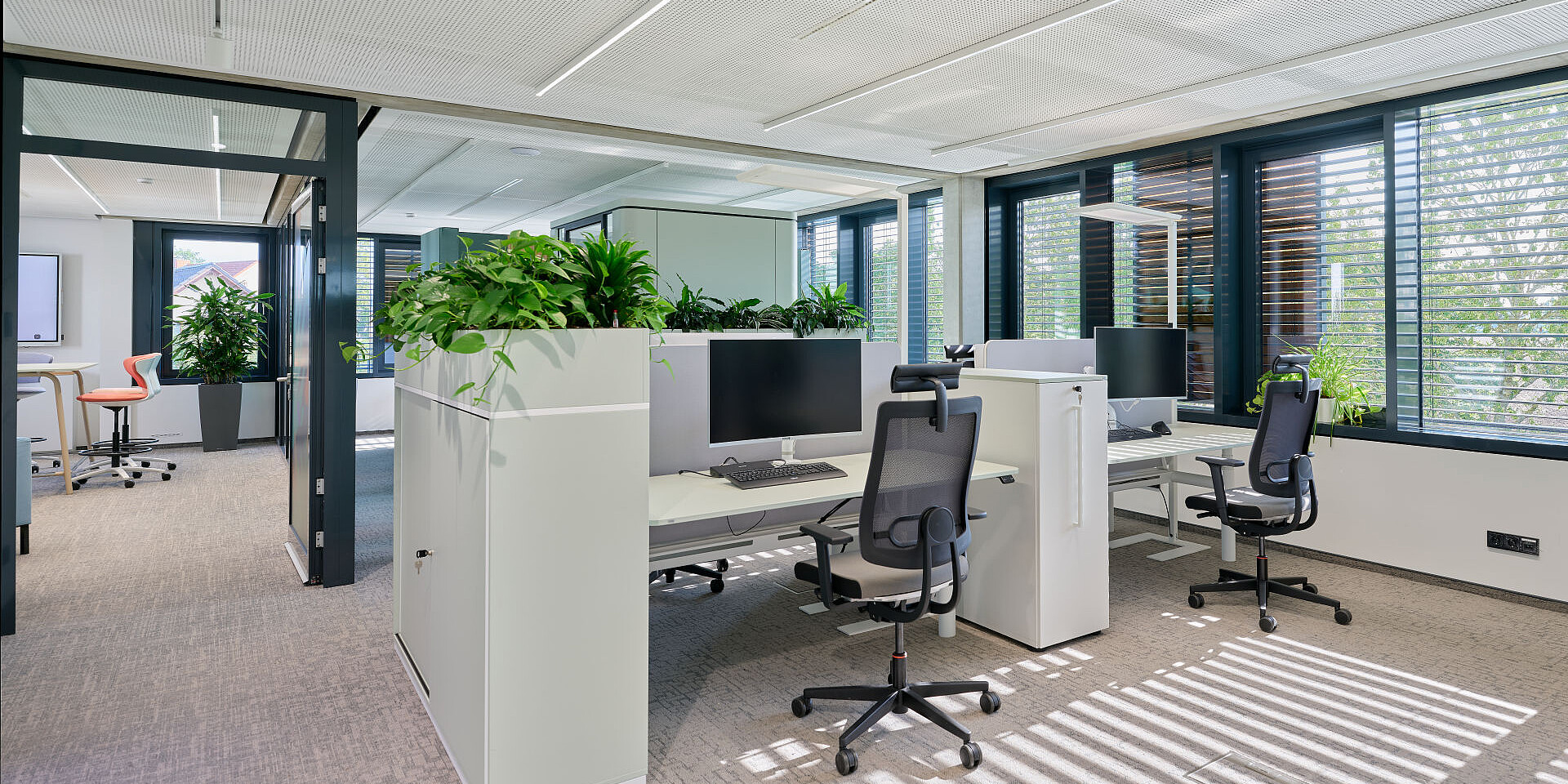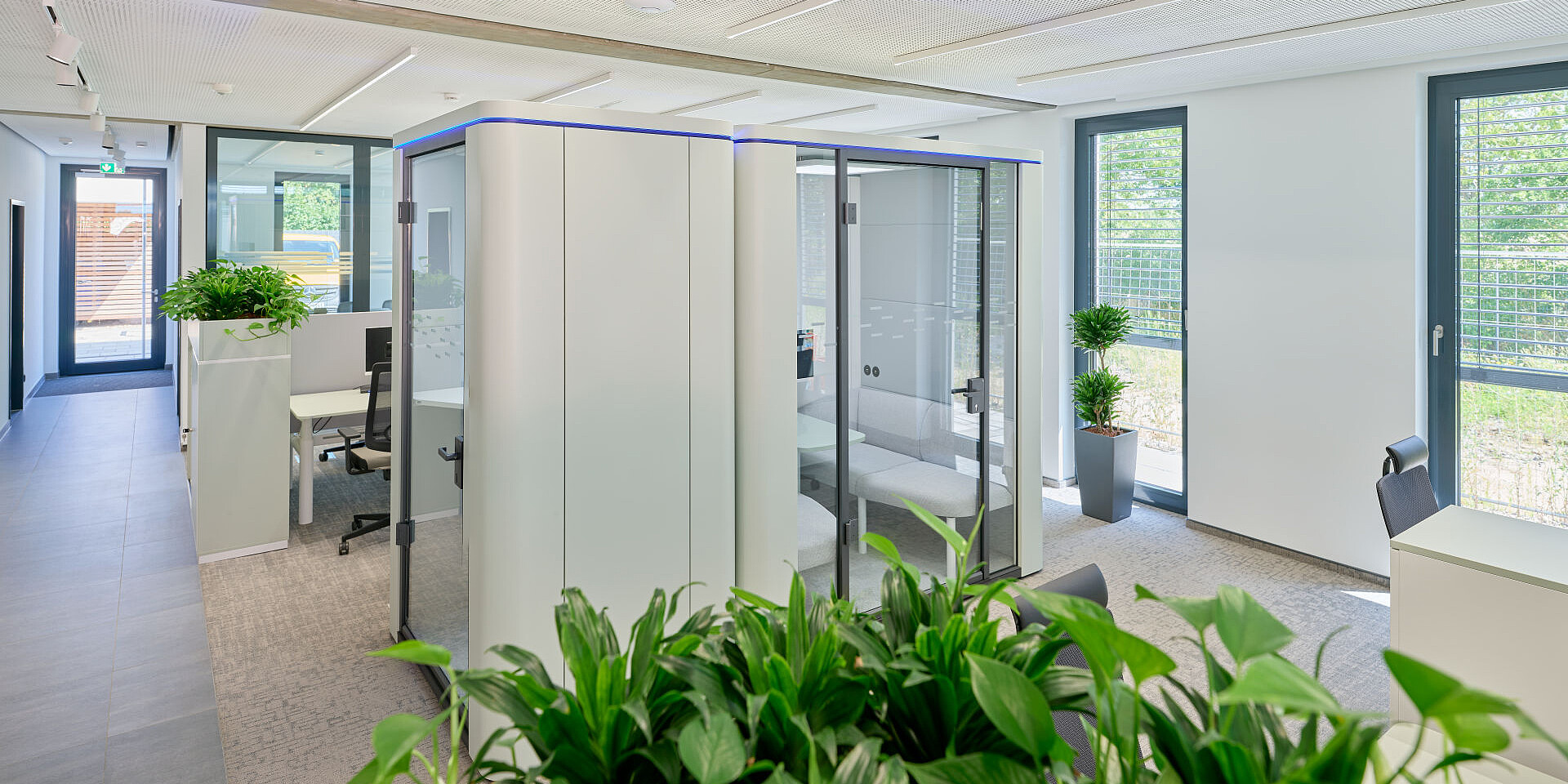 grand slam cabinets help structure the open areas, offering storage and physical zoning without visually enclosing the space. The workstations are complemented by se:cube M room in room solutions that provide dedicated spaces for focused work or confidential conversations, creating a balanced interplay between openness and concentration.