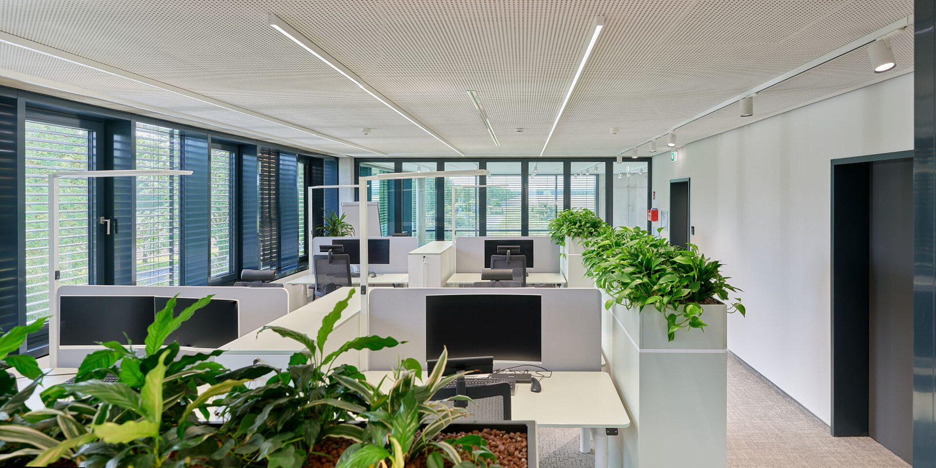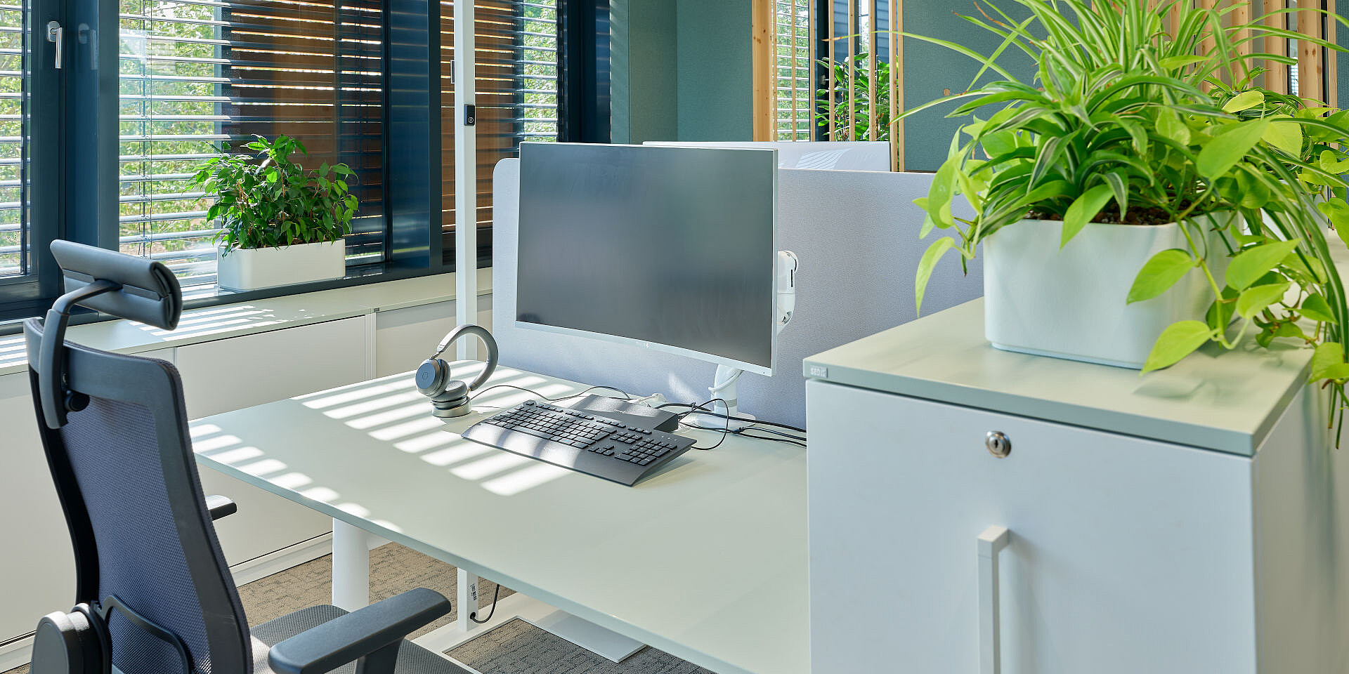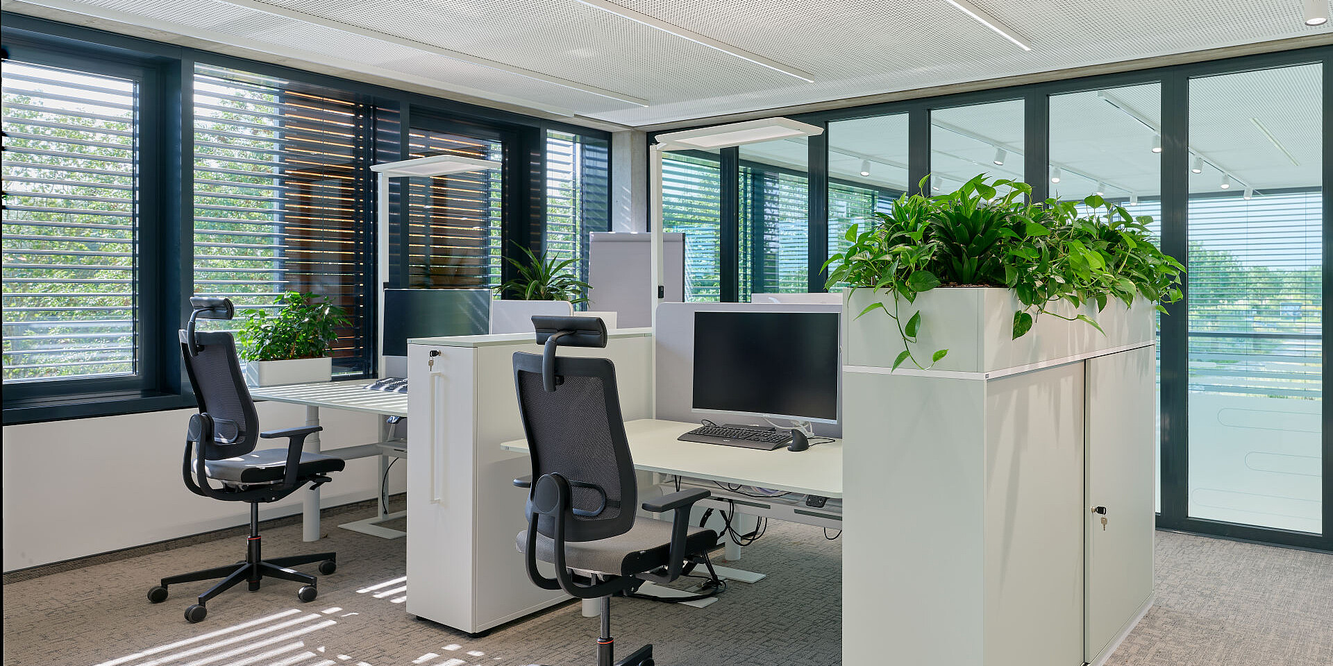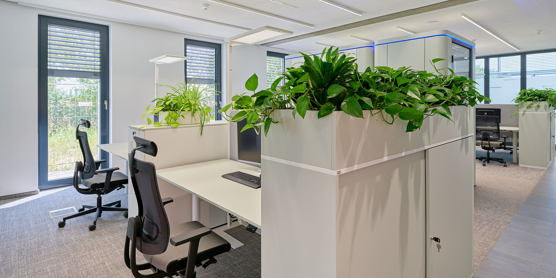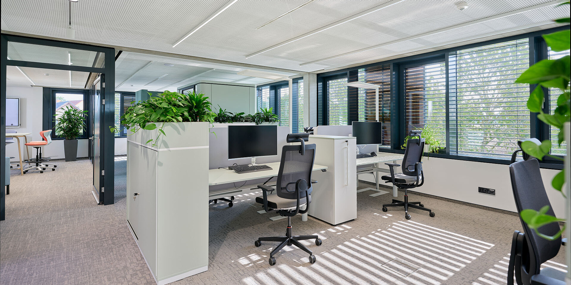 grand slam cabinets help structure the open areas, offering storage and physical zoning without visually enclosing the space. The workstations are complemented by se:cube M room in room solutions that provide dedicated spaces for focused work or confidential conversations, creating a balanced interplay between openness and concentration.