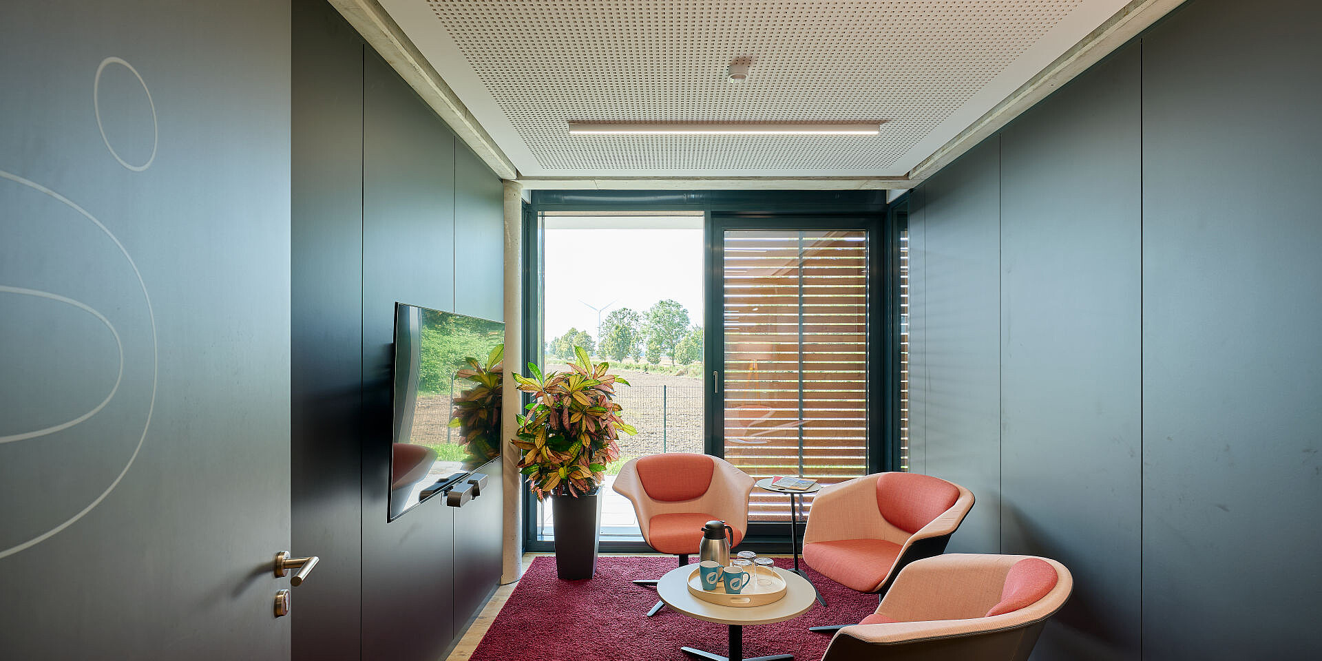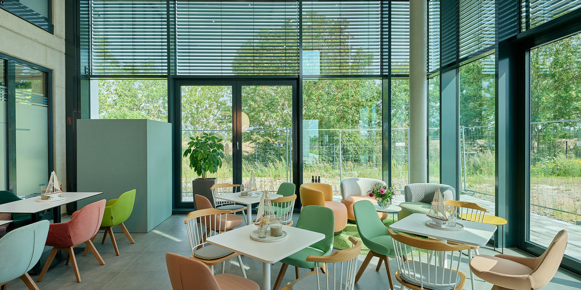Furthermore the theme of sustainability needed to be reflected in the concept and colour scheme. In IZ 1, this was achieved through the use of concrete and wood elements and complemented by bold colour accents. In IZ 2, the palette is dominated by warm, muted and light colours.