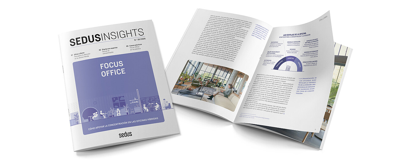 El n.º 20 de Sedus Insights aborda la cuestión del trabajo concentrado en la oficina híbrida y ofrece datos, cifras, entrevistas, tendencias y casos prácticos.