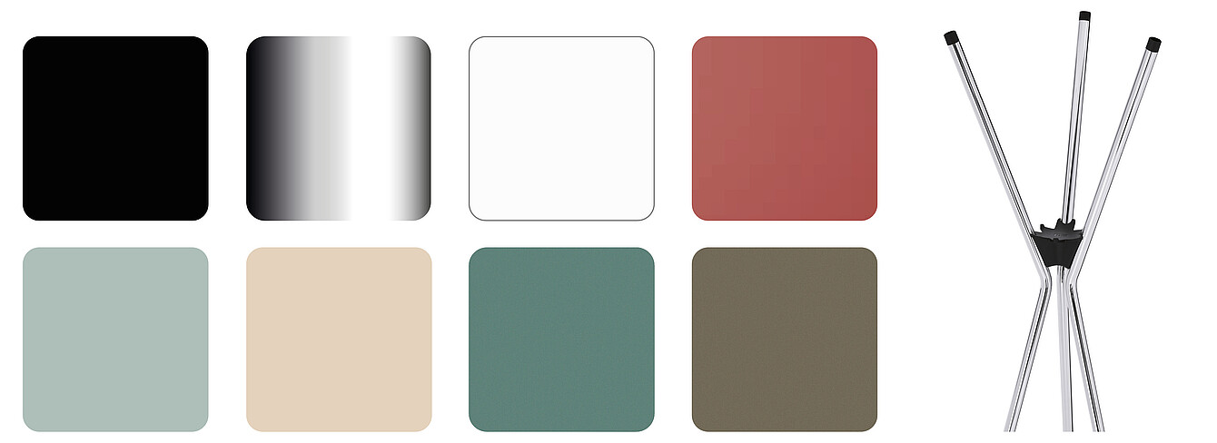 La base puede seleccionarse de color negro, cromado, blanco puro, rojo cayena, verde fiordo, beige arena, verde oscuro o bronce oscuro.