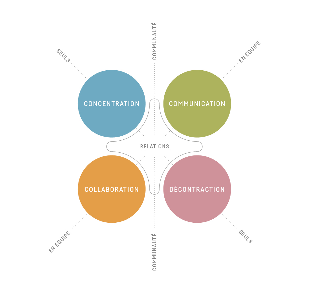 Le travail - à l'ère de la modernité - s'organise en toute flexibilité, au gré des activités qui requièrent différents espaces. Dans ce contexte, les collaborateurs décident eux-mêmes de l'endroit où ils travaillent et de la façon d'accomplir au mieux les tâches qui leur sont confiées. On voit alors alterner différentes situations. Le travail individuel peut ainsi laisser place à la communication, lors d'une réunion spontanée. L'on peut aussi vouloir s'isoler ou se détendre après une séance de travail en équipe. Les bureaux modernes sont donc pensés et conçus pour répondre à ces besoins, en offrant des solutions adaptées aux attentes de chacun.