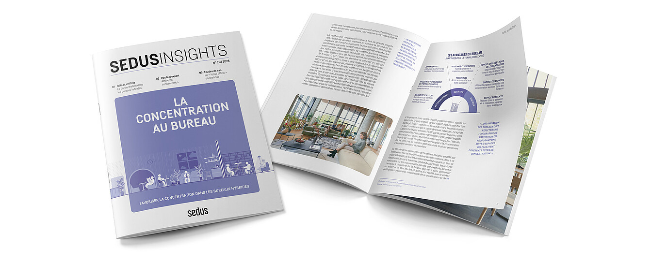 Dans le magazine des tendances Sedus Insights #20, vous découvrirez des résultats de recherches et trouverez des idées concrètes à mettre en œuvre pour « la concentration au bureau ».