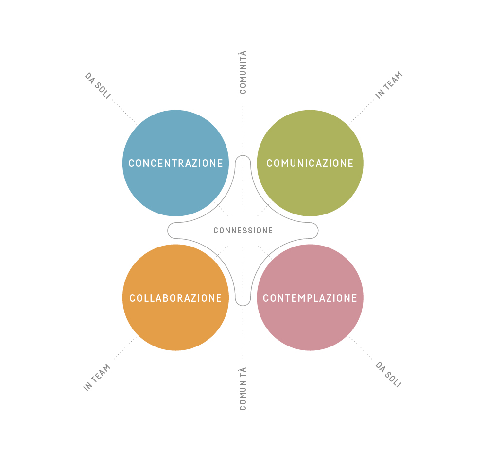 Nel moderno mondo del lavoro le mansioni da svolgere sono improntate alla flessibilità, con la necessità di approntare ambienti di lavoro sempre diversi. Sono dunque i collaboratori stessi a decidere come e dove possono svolgere al meglio i propri compiti, e le situazioni lavorative cambiano continuamente. Le mansioni individuali svolte in concentrazione possono essere seguite da attività che richiedono interazione, e dopo un lavoro in team potrà essere necessario ritirarsi in tranquillità o concedersi un momento di relax, per riflettere o rielaborare. La moderna progettazione degli uffici prende in considerazione queste diverse esigenze e crea di conseguenza adeguate possibilità.