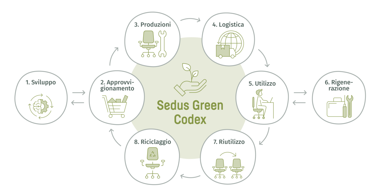 Lo sviluppo, la produzione e la commercializzazione dei prodotti Sedus si ispirano al Sedus Green Codex, all'insegna della trasparenza e della sostenibilità. Le singole fasi del processo rientrano in un sofisticato modello circolare progettato per ridurre al minimo risorse, rifiuti, emissioni ed energia.
