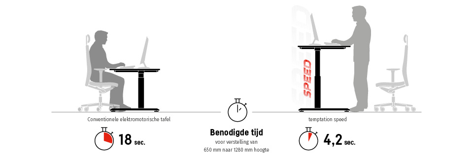 Vaak worden de voordelen van een in hoogte verstelbare tafel niet gebruikt, omdat de verstelling van de onderste in de bovenste positie te lang duurt. temptation speed biedt de oplossing – dankzij een innovatieve elektronica en een krachtige motor wordt de hoogteverstelling bliksemsnel uitgevoerd. Veranderingen van de houding worden gestimuleerd. Snel en eenvoudig.