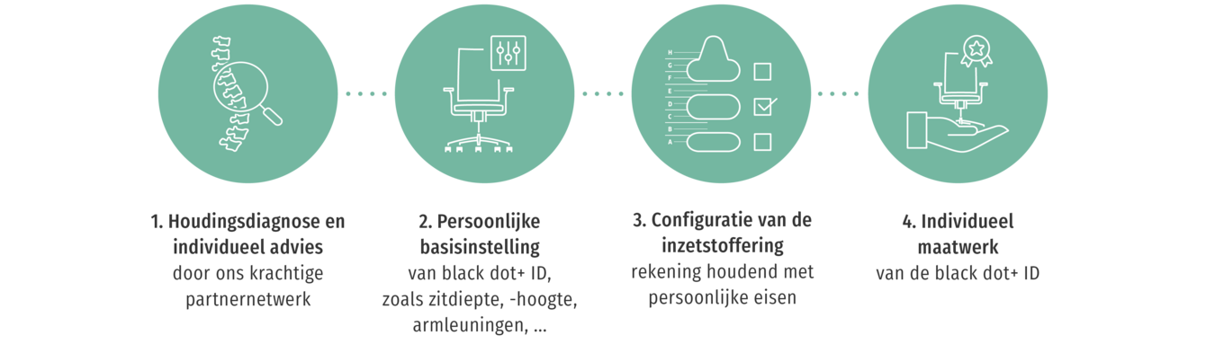 De perfecte bureaustoel moet voldoen aan de persoonlijke eisen van de gebruiker en zodoende individueel aanpasbaar zijn. Net als bij de keuze van een matras of een schoeninlegzool, zijn er verschillende aspecten: het persoonlijke welzijn en het dagelijkse comfort, evenals de verbetering van afwijkingen in de houding of ziektebeelden. Naast de basisfuncties van een ergonomische bureaustoel kan black dot+ ID met de unieke inzetstofferingen gericht en exact op deze eisen worden afgestemd.